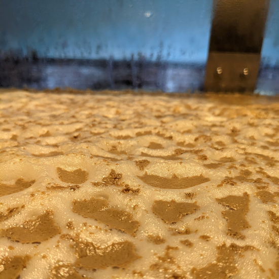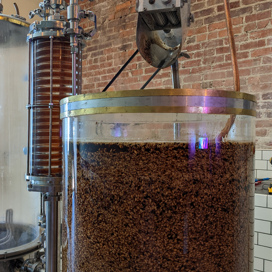 Our main ingredient (grain) takes a rough ride through a fluted roller mill where it is cracked into pieces. On its way, it mixes with hot water and ends up in the mash tun where is rests for an hour while the enzymes get to work turning solid starch into soluable simpler sugars. Our Recirculation Coil maintains a steady temperature for the duration of the rest phase. After the rest, a screen at the bottom of the mash tun allows us to drain off the good stuff (liquid) and leave behind the spent stuff (solids).